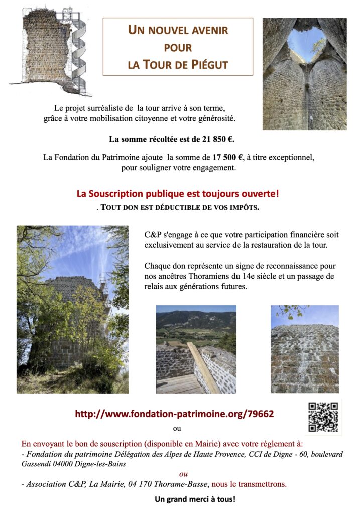 – la Tour de Piégut, projet sur lequel C&P travaille depuis 2017, avec le très large soutien des thoramiens comme en témoigne la souscription de la Fondation du patrimoine.