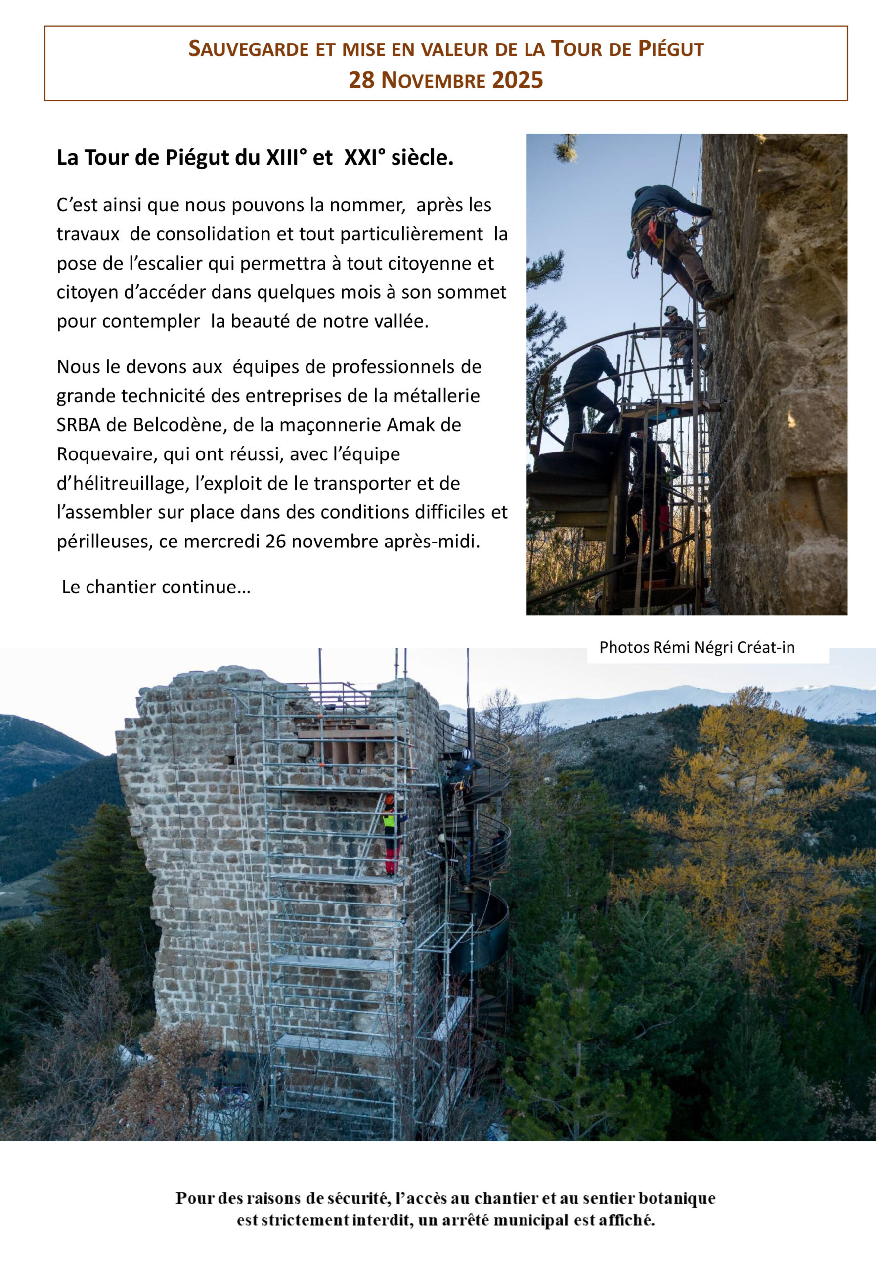 C’est avec émotion que nous vous partageons cette nouvelle information sur le chantier de la tour, suite à l’hélitreuillage et à la pose spectaculaire et remarquable de l’escalier, sur la face Nord de la Tour. Le chantier avance et continue…