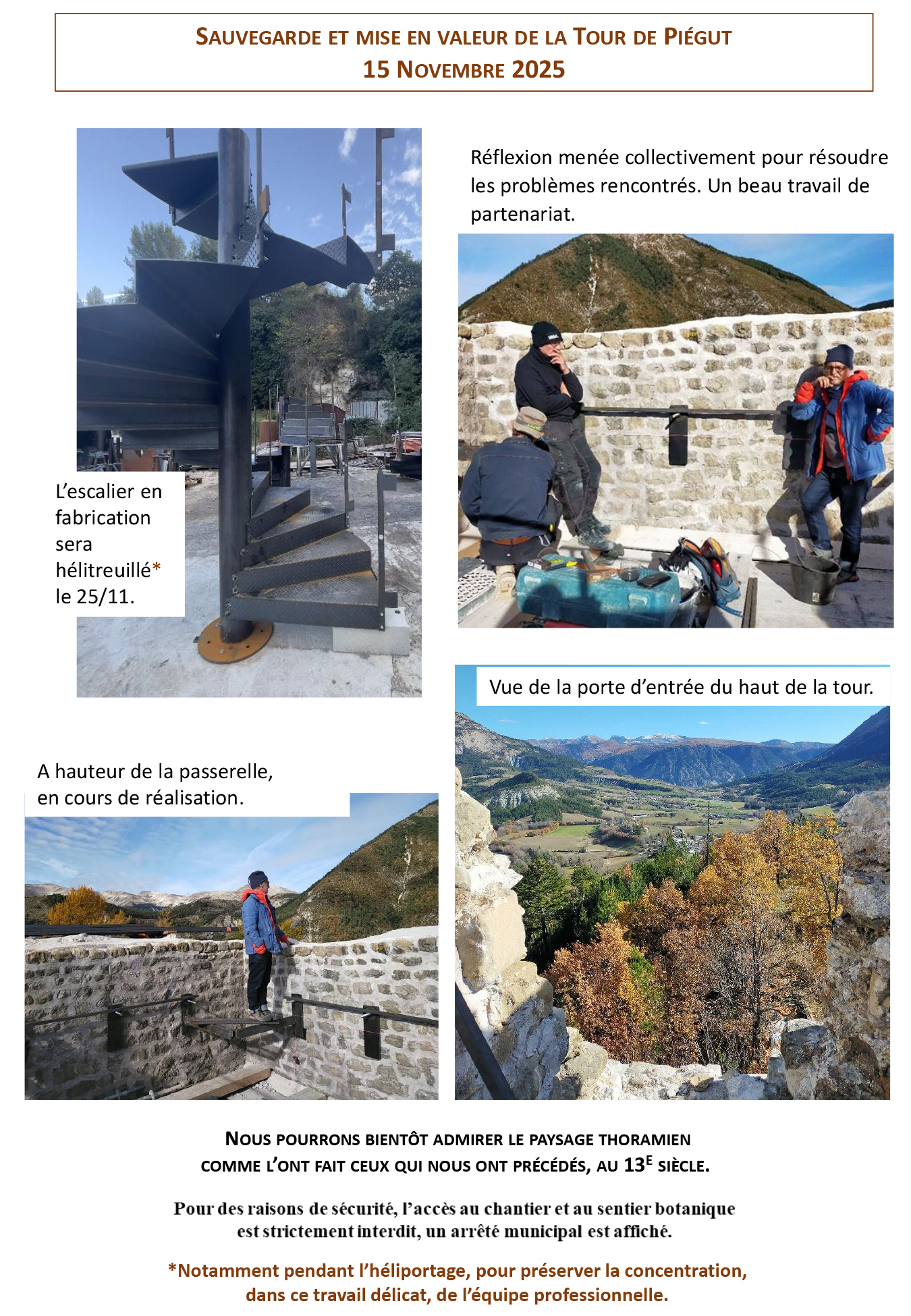 Les héliportages de ces ouvrages seront faits en trois temps fin octobre et courant novembre : d’abord les coursives intérieures, puis l’escalier et enfin les coursives extérieures. Les montages et constructions sur place suivront chaque phase.